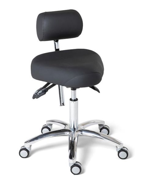 Dynamic comfortabele zadelzitting, verstelbare lage rugondersteuning, hoogteverstelling, verchroomd onderstel en gaslift, antibacteriële onderhoudsvriendelijke bekleding.