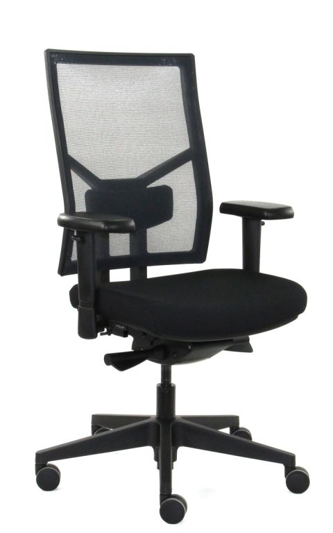 Hoogteverstelbare rugleuning met zwarte netstoffering, verstelbare lendesteun, zwarte comfort zitting, hoogte-, breedte- en diepte-verstelbare armleggers, Tension Plus mechaniek met automatische gewichtsregeling en onafhankelijke rugleuningverstelling, verstelbare zitdiepte 10cm, 140mm NPR gaslift zwart, zwarte kunststof kruisvoet, 60mm multifunctionele wielen, full-service garantie.
