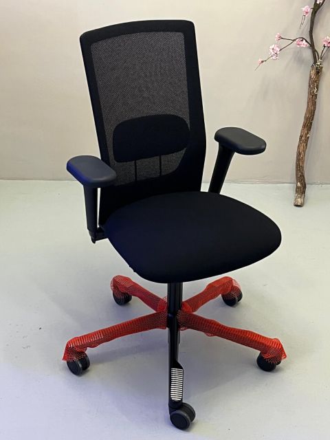 HAG in Balance schommelmechaniek, 3D verstelbare armleuningen en zitdiepte, FutuKnit Night (zwarte) stof zitting met bijpassende netbespanning rugleuning, verstelbare lendesteun, 200mm gaslift, zwart aluminium kruisvoet.