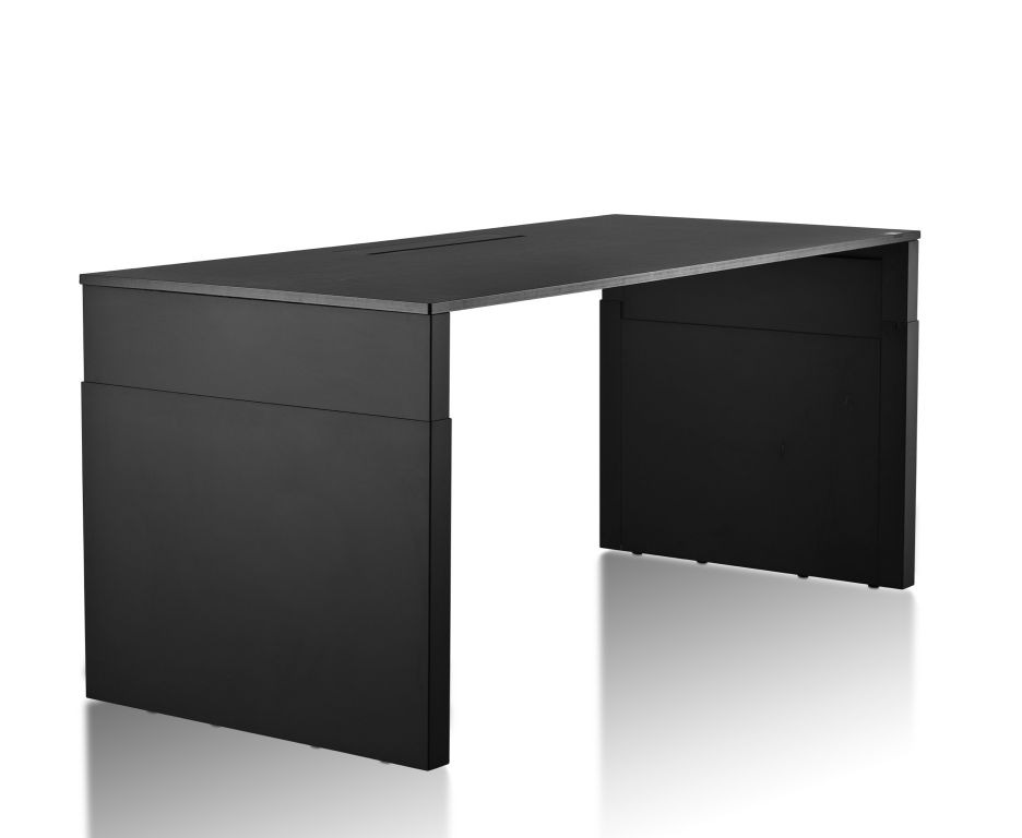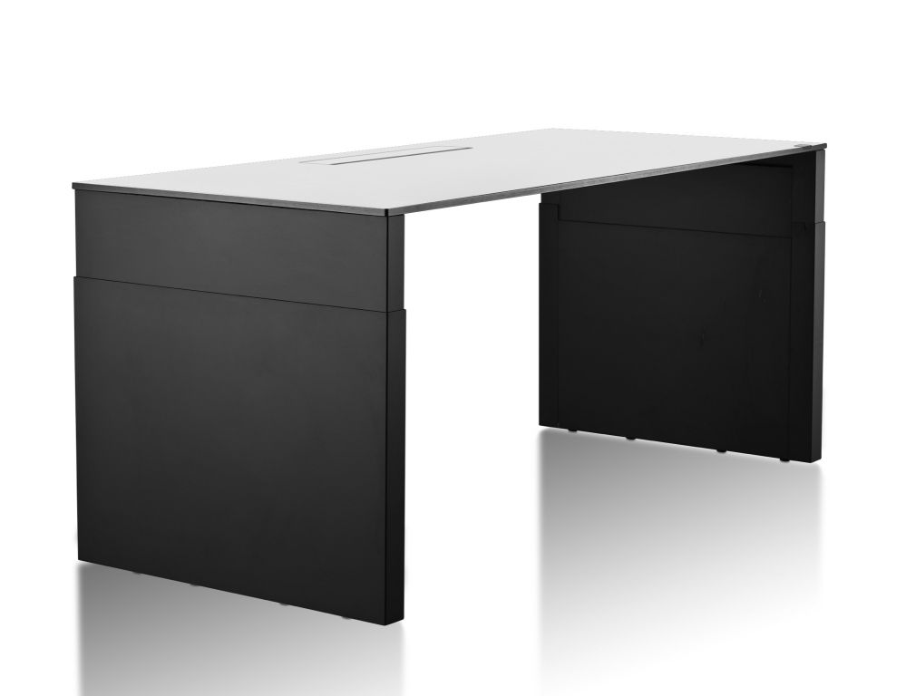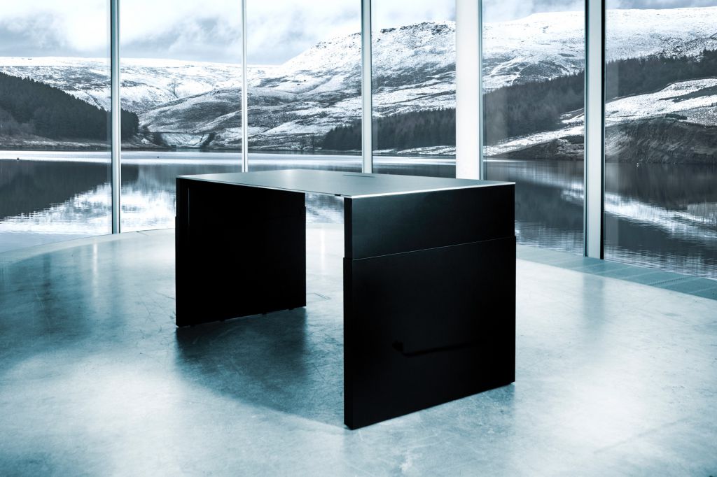Dit is echt een uniek en zeer exclusief zit/sta bureau. Volledig gesloten stalen constructie met een luxe volkern, HPL of aluminium werkblad. Totaal geen storende elementen te zien, alle focus op de strakke rechte hoeken van het bureau. Zelfs de bediening is compleet geintegreerd in het werkblad. Loodzwaar, maar echt een statement voor ieder kantoor. Wat een verschijning!