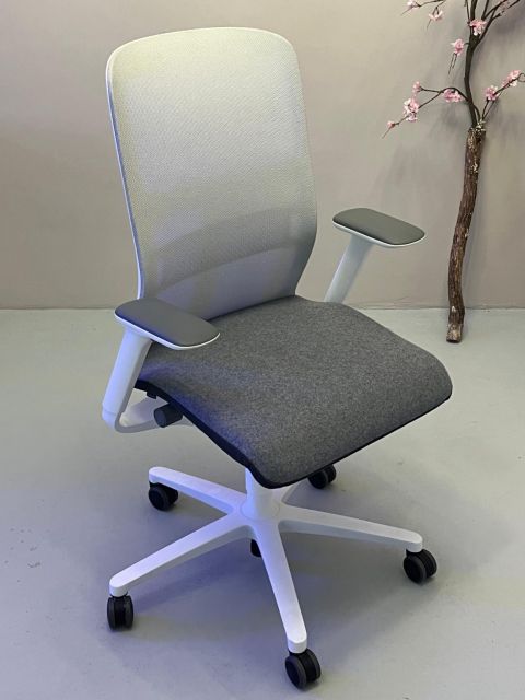 Ergonomisch zitmechaniek, Trimension met zitdiepte instelling, Gestoffeerde zitting middengrijs en witte netweave rugleuning, 3D-verstelbare armleuningen, Verstelbare lendensteun, Traploze zithoogte-instelling, Kunststof kruisvoet, Wit frame.